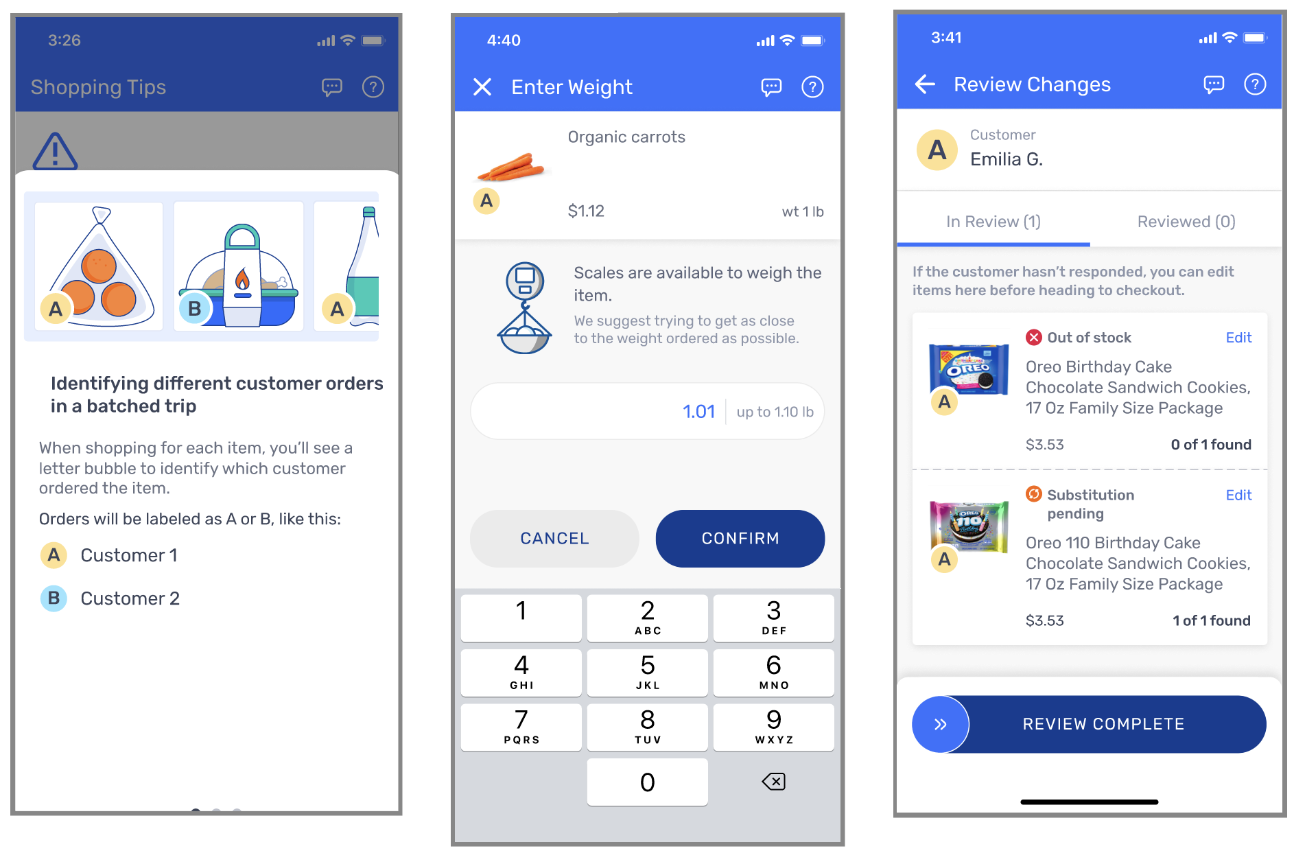 Solution: Offering Spark Driver gig-workers the ability to shop for multiple orders at a time means that Walmart associates are spending fewer resources fulfilling orders. Without the proper content strategy and design walking users through the process, batched shopping would be overcomplicated and confusing. I was focused on clearly creating a way for users to systematically organize orders and reducing cognitive load during shopping and when reviewing order changes. This included creating UI labels for each order, clearly showing items that belong in each order, and offering helpful tips for keeping orders separated in carts and when loading them in vehicles.